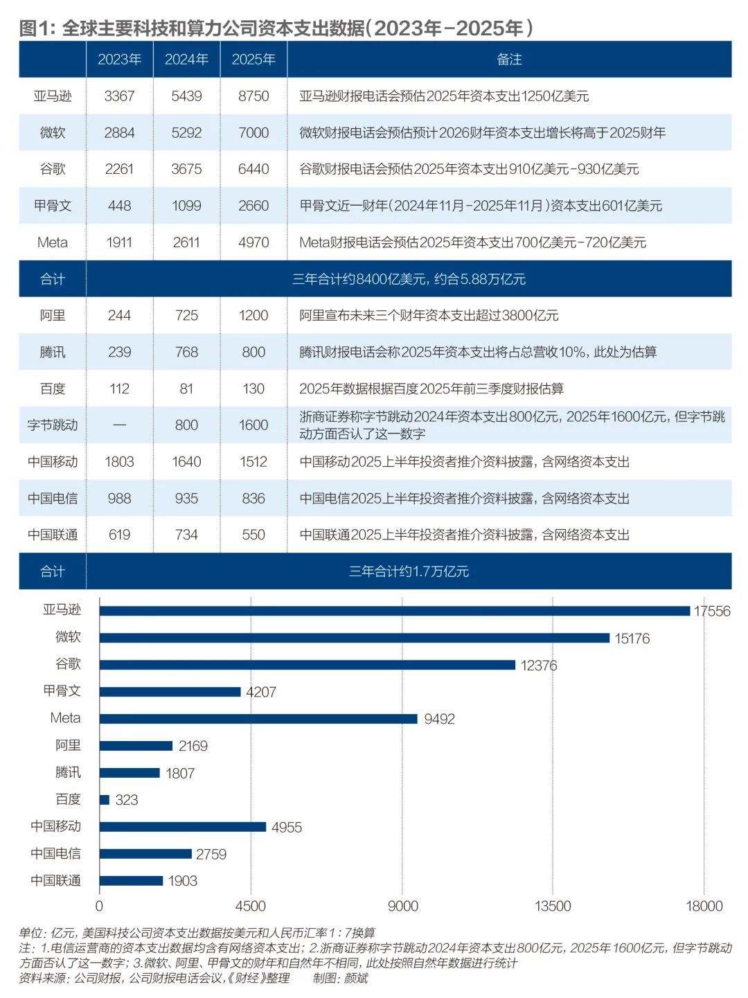 《财经》统计发现,微软、亚马逊、谷歌、甲骨文、Meta 2023年-2025年资本支出总额约8400亿美元(约合5.9万亿元),同期中国科技公司和电信运营商(包括阿里、字节跳动、腾讯、百度、中国移动、中国电信、中国联通)资本支出总额约1.7万亿元。